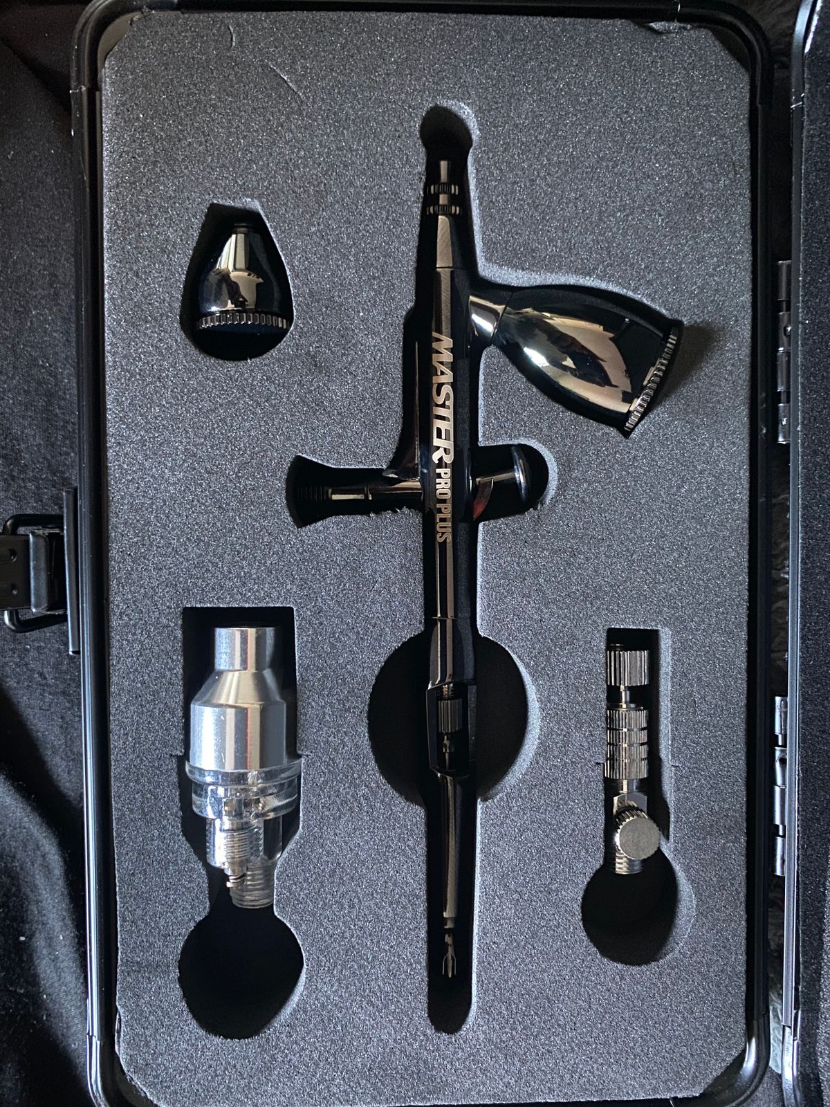 • Master Elite Plus Airbrush Set that comes with airbrushing accessories and is organized in a professional aluminum storage case. This premium smoked black nickel-plated airbrush comes with a 0.3mm needle and nozzle set and two sizes of screw-on gravity cups with lids, sizes 1/4 oz. and 1/16 oz.