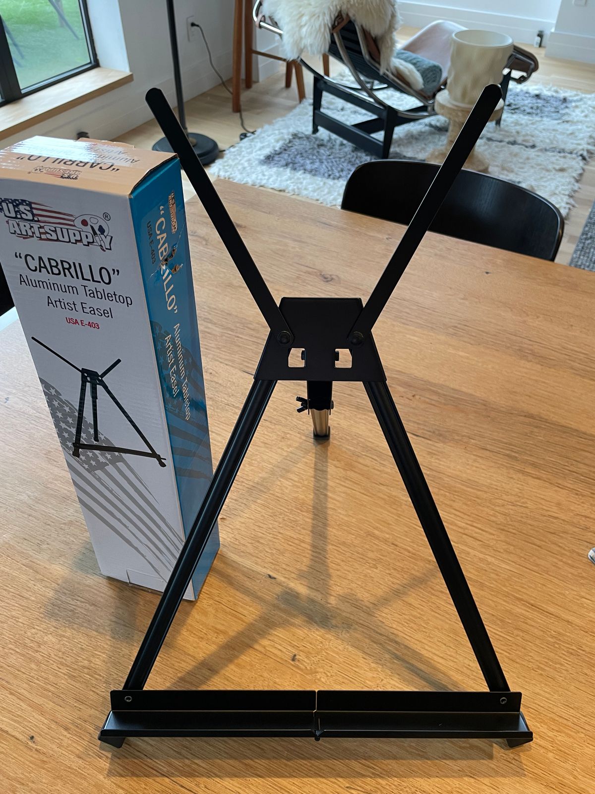 The Cabrillo Model Easel, a premium quality 15" to 21" high black aluminum collapsible folding frame tabletop display easel stand with two 6" high adjustable extension arm wings that can be rotated to bring the height of the easel up to 21". The support wings allow you to stably secure and display items approximately 24" by 30" in size, but less than 10 pounds in weight. Sturdy tripod easel that's made with premium quality lightweight tubular aluminum metal for extra stability. The back leg allows easel angle adjustments. The non-skid rubber feet provide added stability and also protect tabletop surfaces. Easel unfolds to set-up instantly, and at only 1 pound, it's an ideal portable tabletop travel easel.