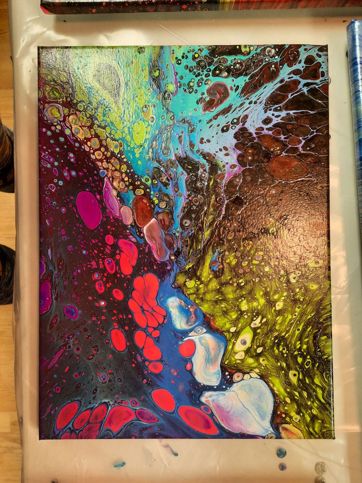• Optional Pouring Masters Silicone oil and Pouring Medium may also be added to adjust viscosity and create additional cells. Can be used with other pouring acrylic mediums to deliver flawless and effortless cells and effects that slide over the canvas.