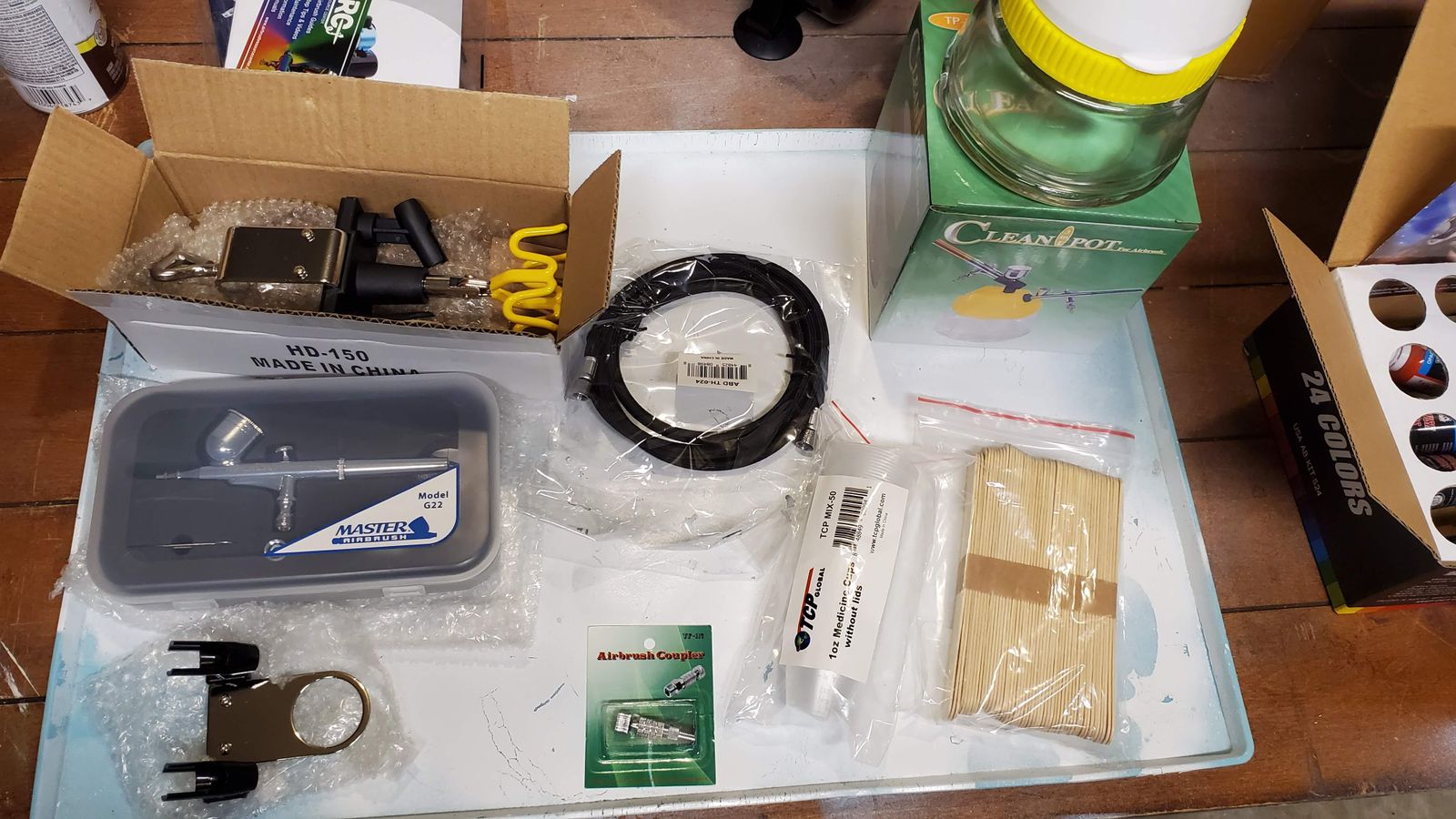 - This deluxe airbrushing system also includes a 6 foot braided air hose, quick disconnect with plug, compressor mounted dual airbrush holder, clamp-on airbrush holder for 4 airbrushes, 3 in 1 use airbrush cleaning pot and a paint mixing stick and cup 50 pack kit.
