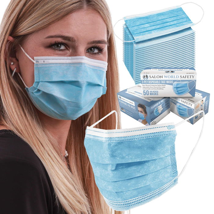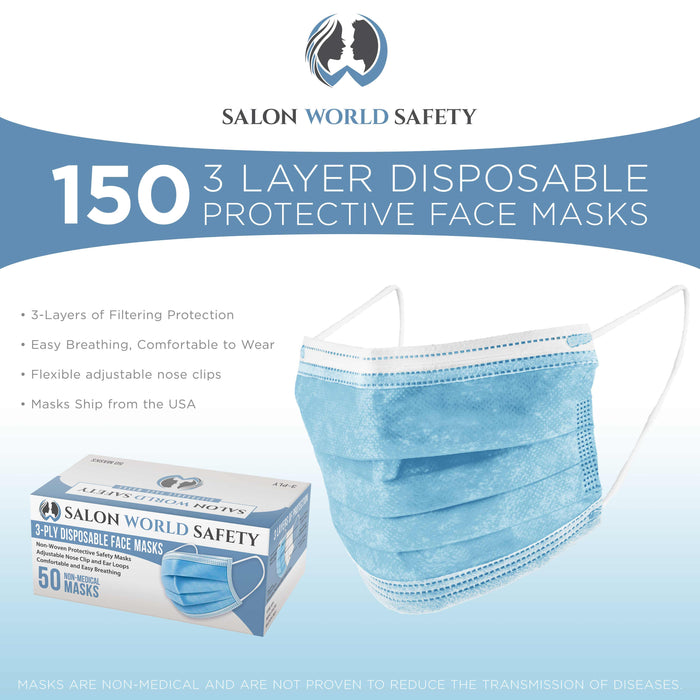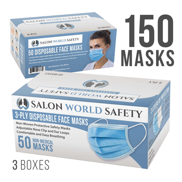 Bulk 3 Boxes (150 Masks) in Sealed Dispenser Boxes of 50 - 3 Layer Disposable Protective Face Masks with Nose Clip & Ear Loops, 3-Ply Non-Woven Fabric