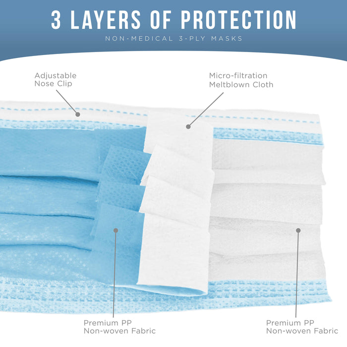 - 3-LAYERS of FILTERING PROTECTION: Our 3-ply masks contain a premium pp non-woven outer filter layer, a premium melt-blown polypropylene filtration layer, and a premium soft absorbent pp non-woven inner filter layer. Soft elastic ear loops and flexible adjustable nose clip.