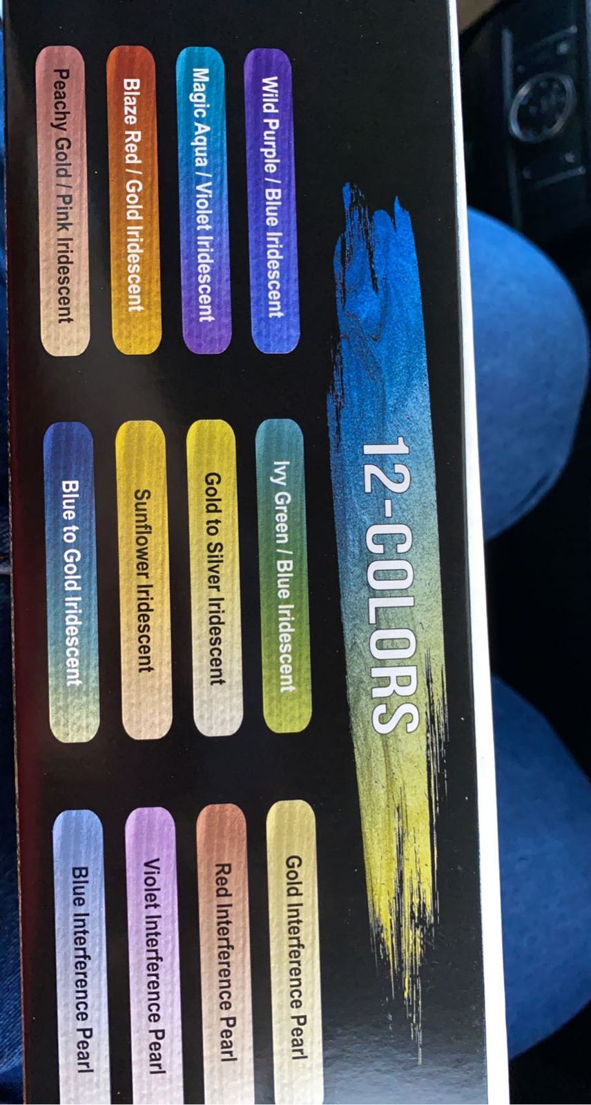- 12 Bright Iridescent Paint Colors: Red interference pearl, blue interference pearl, violet interference pearl, yellow interference pearl, sunflower iridescent, peachy gold/pink iridescent, magic aqua/violet iridescent, ivy green/blue iridescent, wild purple/blue iridescent, gold to silver iridescent, blue to gold iridescent, and blaze red/gold iridescent